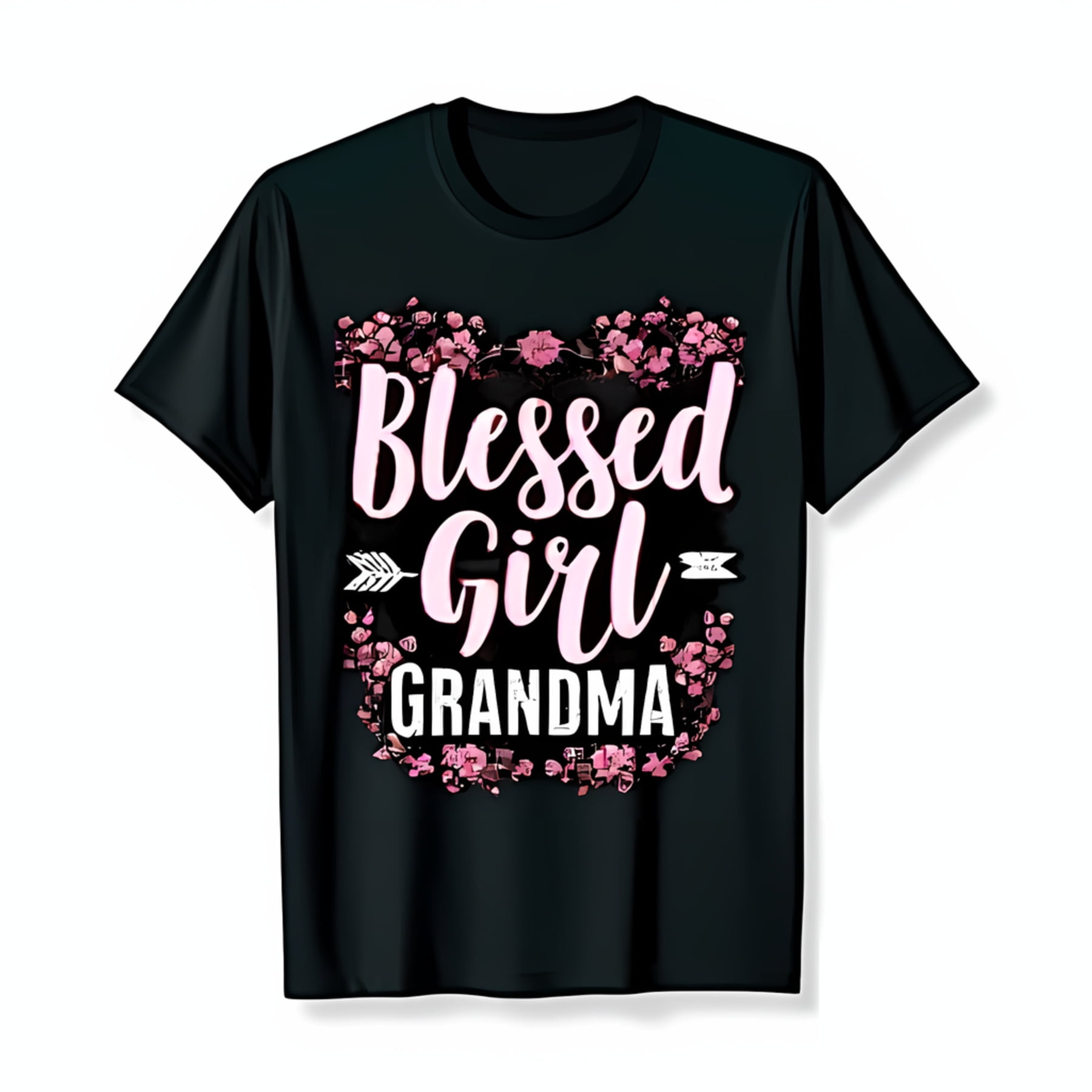 Black T-Shirt with Pink Flowers & ‘Blessed Girl Grandma’ Graphic Design